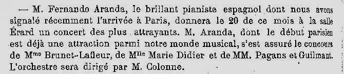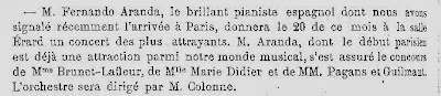 “El joven pianista y organista D. Fernando Aranda ha instalado en su domicilio un pequeño salón de conciertos con un magnífico órgano de canutería y varios salones para la enseñanza de piano, órgano, acompañamiento y música de concierto. Es digno de hacerse notar que será la primera vez que puedan tomarse lecciones de órgano en una casa particular”.